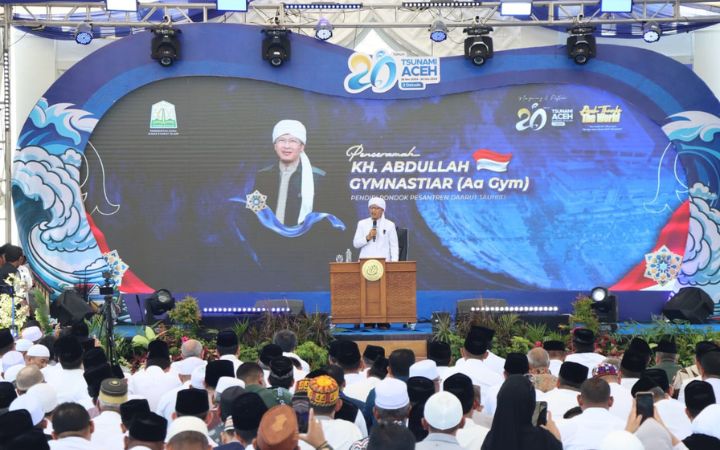 Komparatif.ID, Banda Aceh— KH. Abdullah Gymnastiar, atau yang akrab disapa Aa Gym, memberikan tausiah penuh makna dalam peringatan 20 tahun Tsunami Aceh di Halaman Masjid Raya Baiturrahman Banda Aceh pada Kamis, (26/12/2004).