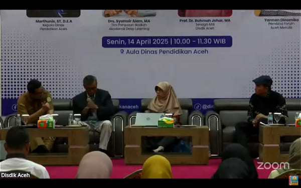 Dalam Kuliah Umum yang digelar Dinas Pendidikan Aceh dan Yayasan Sukma Bangsa, Senin (14/4/2025) di Aula Disdik Aceh, bertajuk “Deep Learning; Menuju Pendidikan Bermutu untuk Semua”, para narasumber berpendapat bahwa demi meningkatkan kualitas pendidikan di Aceh, termasuk meningkatkan mutu lulusan, perlu adanya upaya pembelajaran mendalam, demi menciptakan generasi Aceh yang cerdas, jujur, dan Tangguh.