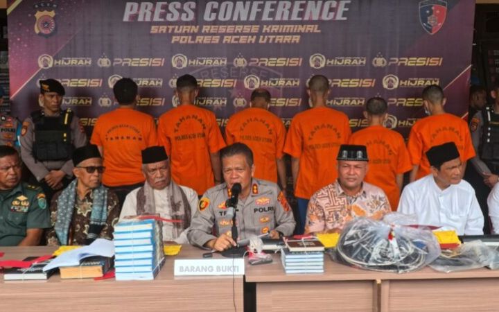 “Ada enam orang dari kelompok ajaran menyimpang yang diamankan. Tiga diantaranya ditangkap di sebuah masjid di Kabupaten Aceh Utara,” terang Kapolres Aceh Utara AKBP Tri Aprianto pada konferensi pers bersama Bupati Aceh Utara Ismail A. Jalil dan Ketua Majelis Permusyawaratan Ulama (MPU) Aceh Utara, Abu Manan di Lhoksukon, Kamis (7/8/2025)