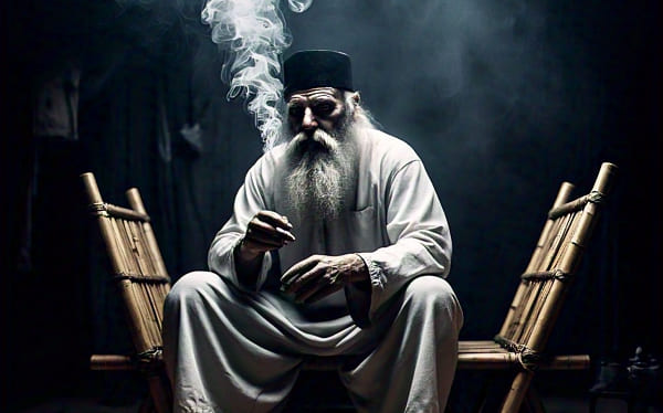 Sekitar pukul 00.00 WIB, terdengar suara langkah dari arah sungai. Lamat-lamat terlihat seorang pria berjanggut, memakai kopiah hitam pudar, dan di pinggangnya dililit sehelai sarung warna biru bermotif kotak.