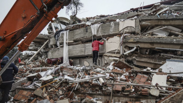 Seorang pria mencari korban di reruntuhan bangunan yang hancur di Gaziantep, Turki, Senin (7/2/2023). Foto: AP.