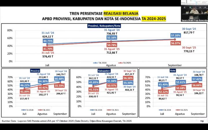 Namun di sisi lain, realisasi belanja justru menurun. Hingga akhir kuartal III 2025, tingkat belanja daerah baru mencapai 56,07 persen, turun dari 57,20 persen dibandingkan pada 2024.