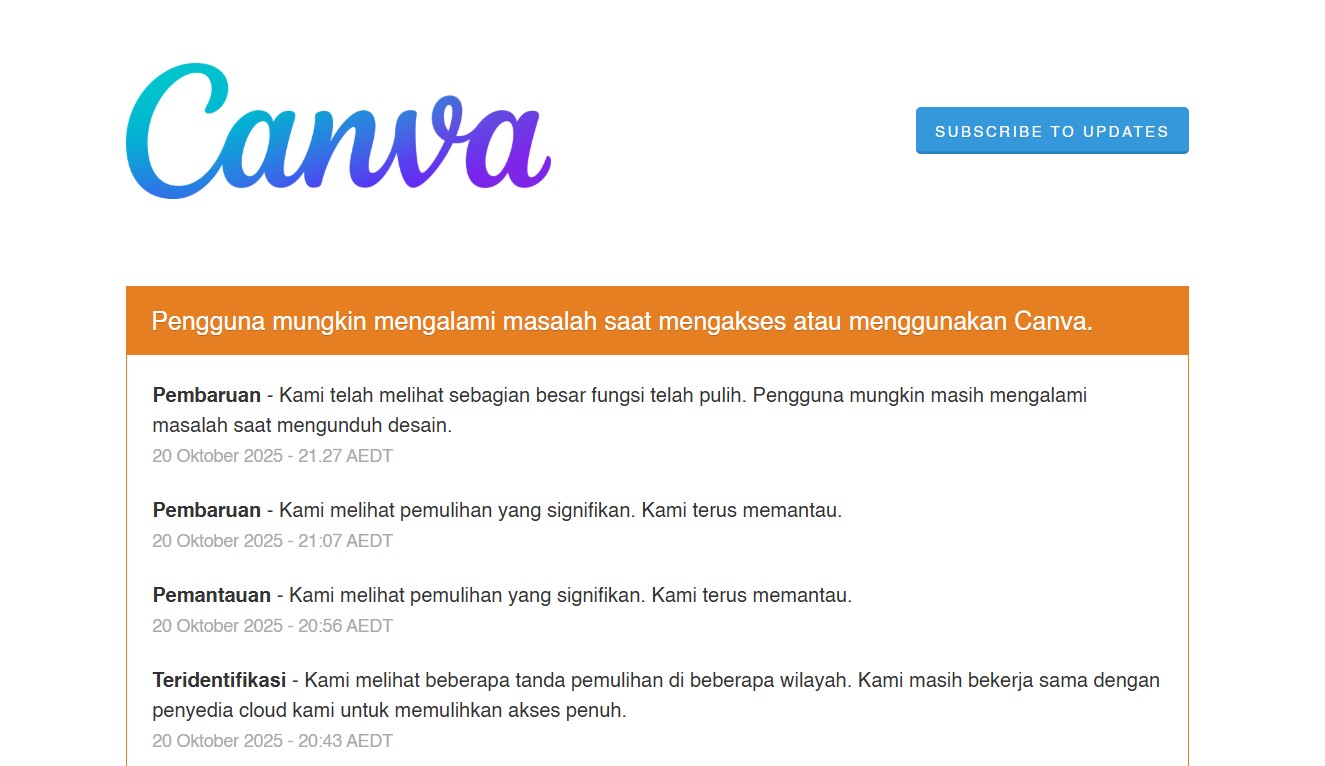Sekitar pukul 17.43 WIB (20.43 AEDT), Canva mulai melaporkan adanya tanda-tanda pemulihan di beberapa wilayah. “Kami melihat beberapa tanda pemulihan di beberapa wilayah dan terus bekerja sama dengan penyedia cloud kami untuk memulihkan akses penuh,” tulis perusahaan dalam pembaruannya.