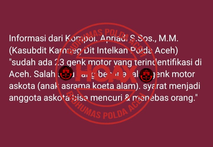“Informasi terkait teridentifikasinya 23 geng motor di Aceh dipastikan hoaks. Personel Polda Aceh yang dicatut namanya juga tidak pernah memberikan informasi tersebut,” kata Joko secara tegas, dalam keterangannya di Polda Aceh.