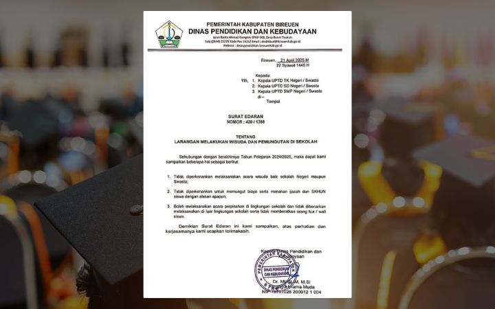 Komparatif.ID, Bireuen— Dinas Pendidikan dan Kebudayaan (Disdikbud) Kabupaten Bireuen melarang seluruh sekolah, baik negeri maupun swasta, untuk melaksanakan kegiatan wisuda pada akhir Tahun Pelajaran 2024/2025.