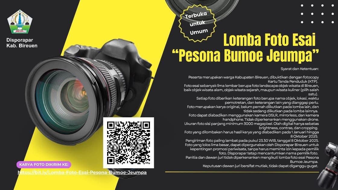 Komparatif.ID, Bireuen— Dinas Pemuda, Olahraga, dan Pariwisata (Disporapar) Kabupaten Bireuen mengumumkan gelaran lomba foto essay bertajuk Pesona Bumoe Jeumpa dalam rangka memeriahkan Hari Ulang Tahun ke-26 Kabupaten Bireuen yang jatuh pada 12 Oktober 2025 mendatang.
