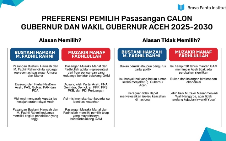 Komparatif.ID, Banda Aceh— Survei terbaru yang dilakukan oleh Bravo Fanta Institute (BFI) menunjukkan elektabilitas pasangan Bustami-Fadhil Rahmi mengungguli pesaingnya, pasangan Muzakir Manaf (Mualem) dan Fadhlullah (Dek Fadh) jelang Pilkada Aceh 2024.