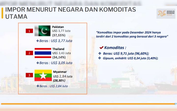 “Menarik ini, peringkat pertama, kedua, ketiga impor adalah beras. Ini kondisi Desember, kita lihat juga di Januari apakah juga impor beras nanti kita akan tunggu rilis di bulan berikutnya,” jelas Riswan, Senin (3/2/2025).