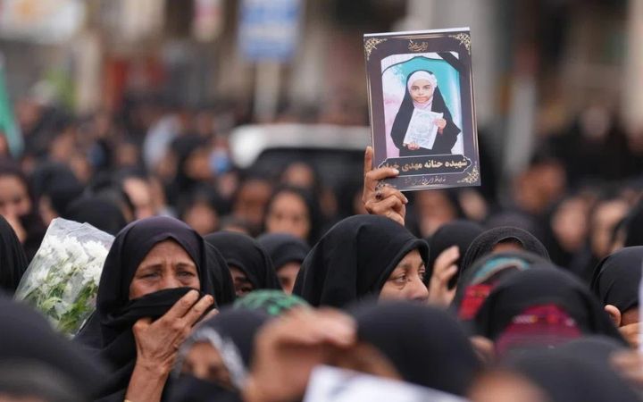 Warga Iran saat upacara pemakaman para korban serangan Amerika Serikat dan Israel terhadap sekolah perempuan di kota Minab, Iran. Foto: EPA.