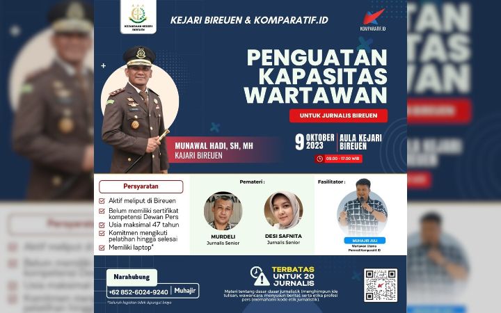 Komparatif.ID, Bireuen—Kejaksaan Negeri (Kejari) Bireuen dan media online Komparatif.Id, akan menggelar penguatan kapasitas untuk wartawan di Kabupaten Bireuen. kegiatan tersebut akan dilaksanakan pada Senin (9/10/2023) di Aula Kejari Bireuen.