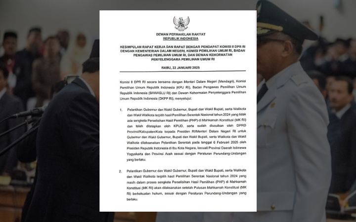 Keputusan itu merupakan hasil kesepakatan Komisi II DPR RI bersama Kementerian Dalam Negeri (Kemendagri) usai rapat kerja dan rapat dengar pendapat dengan Kemendagri, KPU, Bawaslu, dan DKPP, pada Rabu (22/1/2025).