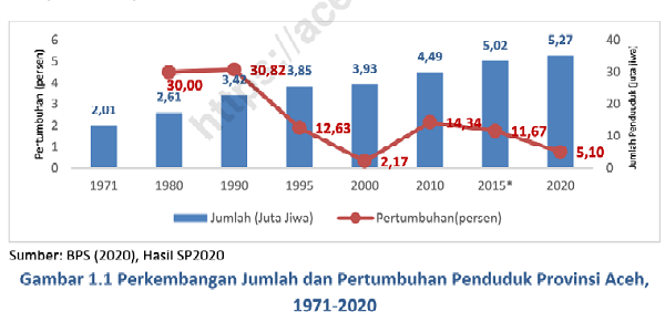 Dari tahun 1971 hingga 1980, jumlah pertumbuhan penduduk Aceh melaju hingga 30 %. Dari 1980 menuju 1990, bertumbuh lagi menjadi 30,82 %. Dengan persentase demikian, dari jumlah penduduk 2,01 juta jiwa pada 1971, menjadi 2,61 juta jiwa pada tahun 1980. Kemudian menjadi 3,42 juta jiwa pada tahun 1990.