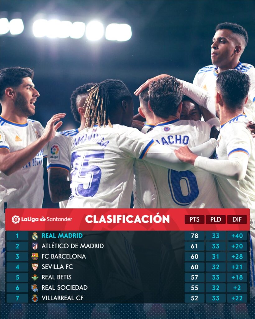Real Madrid asuhan Ancelotti kini unggul 17 poin atas peringkat kedua Atletico Madrid, masing-masing sudah memainkan 33 pertandingan. Los Blancos belum bisa mengunci gelar juara, karena Barcelona diperingkat tiga dengan 60 poin masih memiliki dua pertandingan lebih sedikit, sementara Sevilla di urutan keempat memiliki satu poin lebih sedikit dari Atletico dengan satu pertandingan lebih banyak dari kedua klub Madrid.