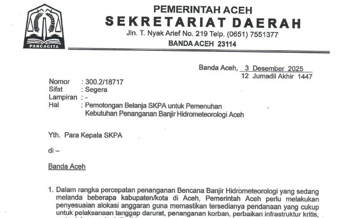 Dalam surat tersebut, Pemerintah Aceh menyampaikan pemotongan anggaran dilakukan untuk memastikan tersedianya pendanaan memadai bagi pelaksanaan kegiatan tanggap darurat, penanganan korban, perbaikan infrastruktur yang terdampak, dan dukungan logistik di lapangan.