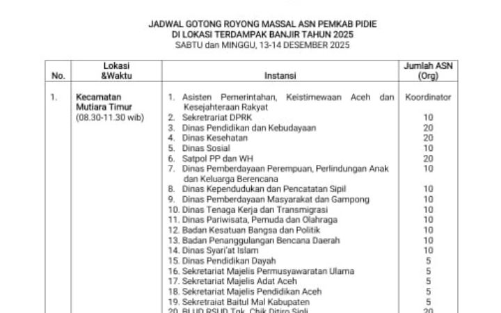 Komparatif.ID, Sigli— Pemkab Pidie mengerahkan ratusan Aparatur Sipil Negara untuk membersihkan sisa banjir bandang beberapa waktu lalu. Kegiatan gotong royong massal tersebut dijadwalkan berlangsung selama dua hari penuh, yaitu pada Sabtu dan Minggu (13-14/12/2025), serta melibatkan puluhan instansi dan satuan kerja perangkat kabupaten.