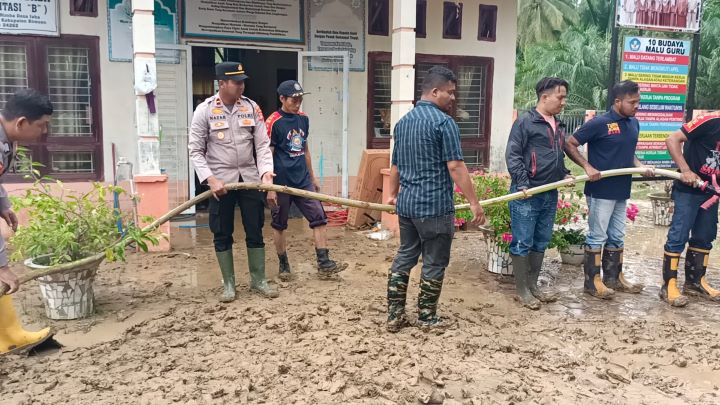 Komparatif.ID, Bireuen– Jajaran kepolisian Polsek Peudada bersama warga Gampong Jaba, Kecamatan Peudada, membersihkan area SDN 17 Peudada yang berlumpur usai banjir yang melanda kawasan tersebut.