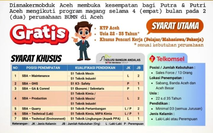 Komparatif.ID, Banda Aceh— Dinas Tenaga Kerja dan Mobilitas Penduduk (Disnakermobduk) Aceh membuka program magang di SBA dan Telkomsel serta lima lokasi lain di kabupaten/kota di Aceh.