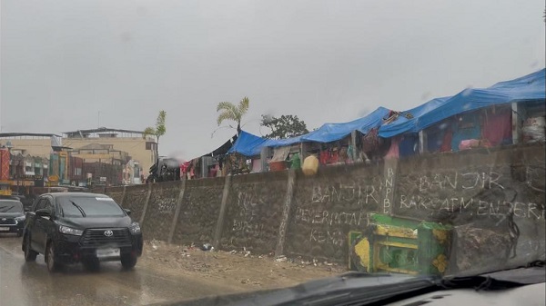 Di pingir-pinggir jalan tampak tenda-tenda biru pengungsian yang dibuat oleh masyarakat, tenda itu begitu sederhana dan tidak cukup untuk melindungi orang yang berada di dalamnya dari guyuran hujan.