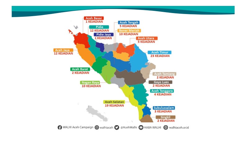 Berdasarkan catatan WALHI Aceh, sejak 2019-2023 total kejadian interaksi negatif satwa dengan manusia sebanyak 113 kali. 68 kali melibatkan harimau, 33 kali gajah, orang utan 11 kali dan badak satu kali.