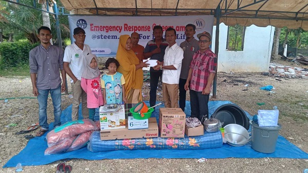 Bantuan yang diserahkan oleh Steemian Aceh Jaya berupa uang tunai sebesar Rp600.000,- dan barang-barang lain berupa 1 kompor gas, 1 rice cooker , 1 blender, 1 tilam tidur dan 3 bantal, 1 ember, 2 pasang seragam sekolah dan 1 set peralatan masak.