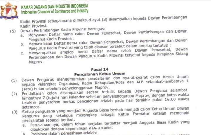 Menurutnya bila merujuk AD/ART dan PO Kadin, tidak ada kalimat seperti yang ditambahkan dalam point 3 persyaratan untuk mendaftar sebagai calon Ketua Umum Kadin Aceh.