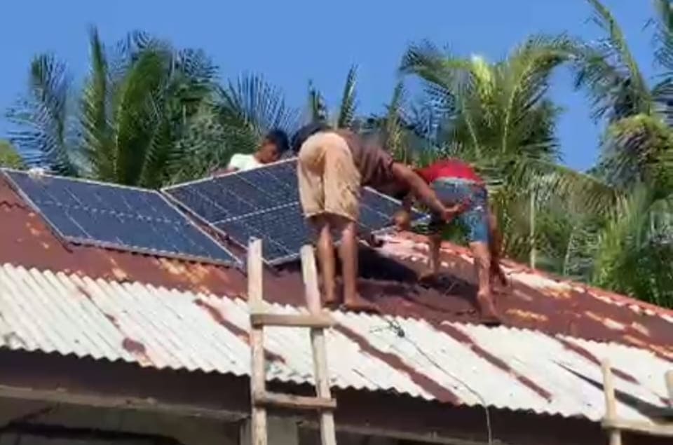 Proses pemasangan paket PLTS hibrid dilakukan secara gotong royong dengan melibatkan warga setempat.