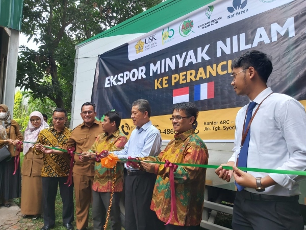 Kegiatan ekspor minyak nilam Aceh dilepas oleh Rektor Universitas Syiah Kuala Prof. Dr. Ir. Marwan, di Kantor ARC-PUIPT Nilam Aceh USK. Nilai ekspor nilam Aceh kali ini Rp2,5 ton.